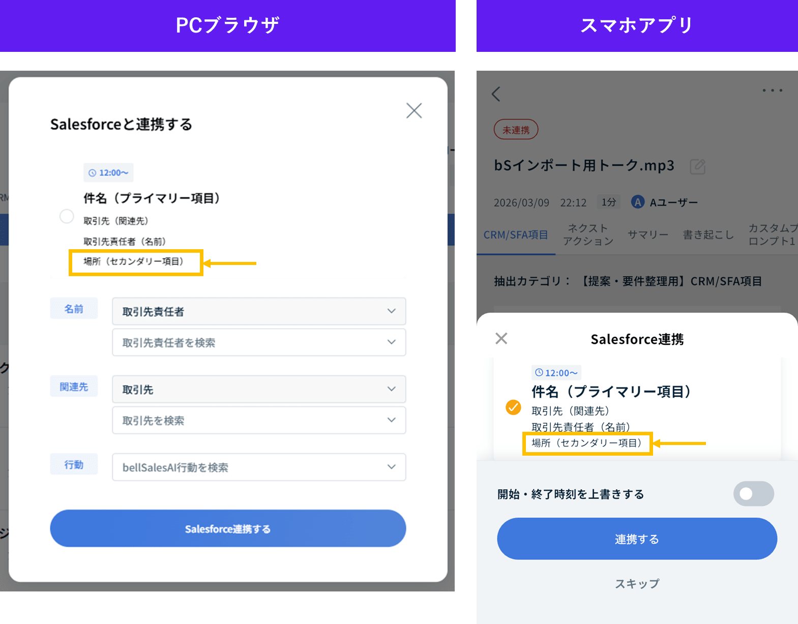 Salesforceカレンダーからの行動サジェストの場合、連携先の情報に「セカンダリー項目」が表示されるようになります。