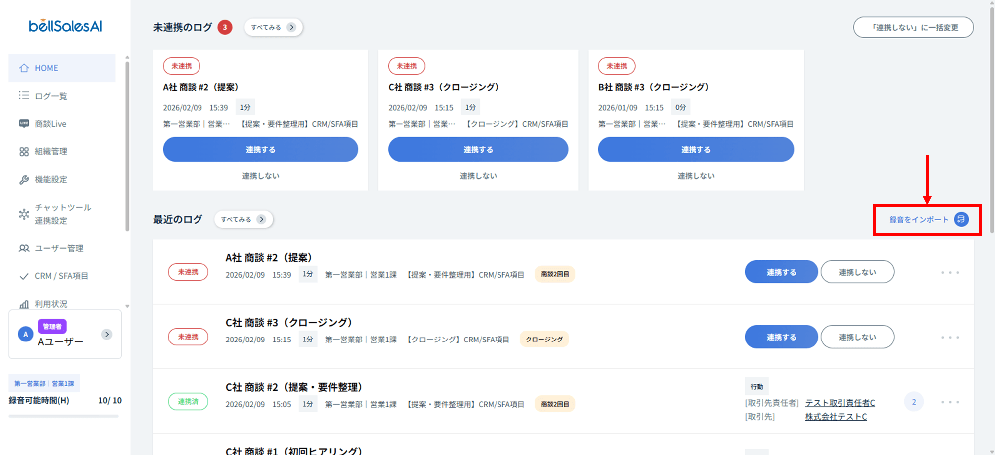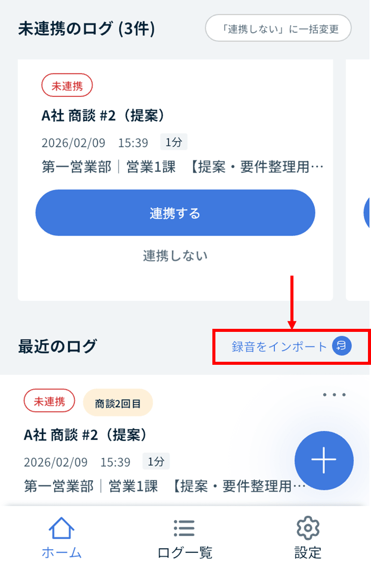 HOME(ホーム)画面の「最近のログ」枠右上の、「録音をインポート」をクリック/タップします。