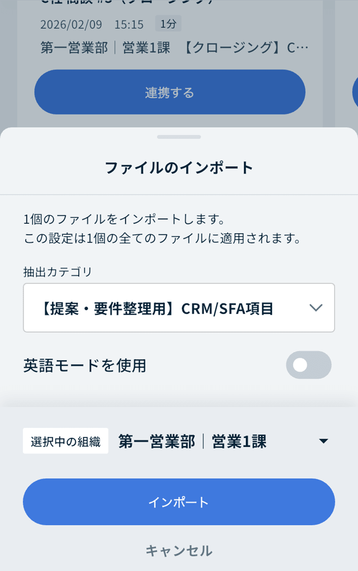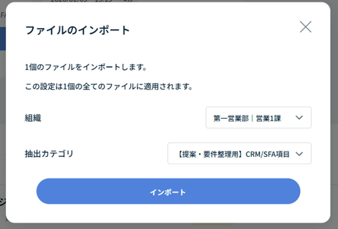 インポートをおこなう組織、ログの抽出カテゴリ(CRM/SFA項目)を選択し、[インポート]をクリック/タップします。