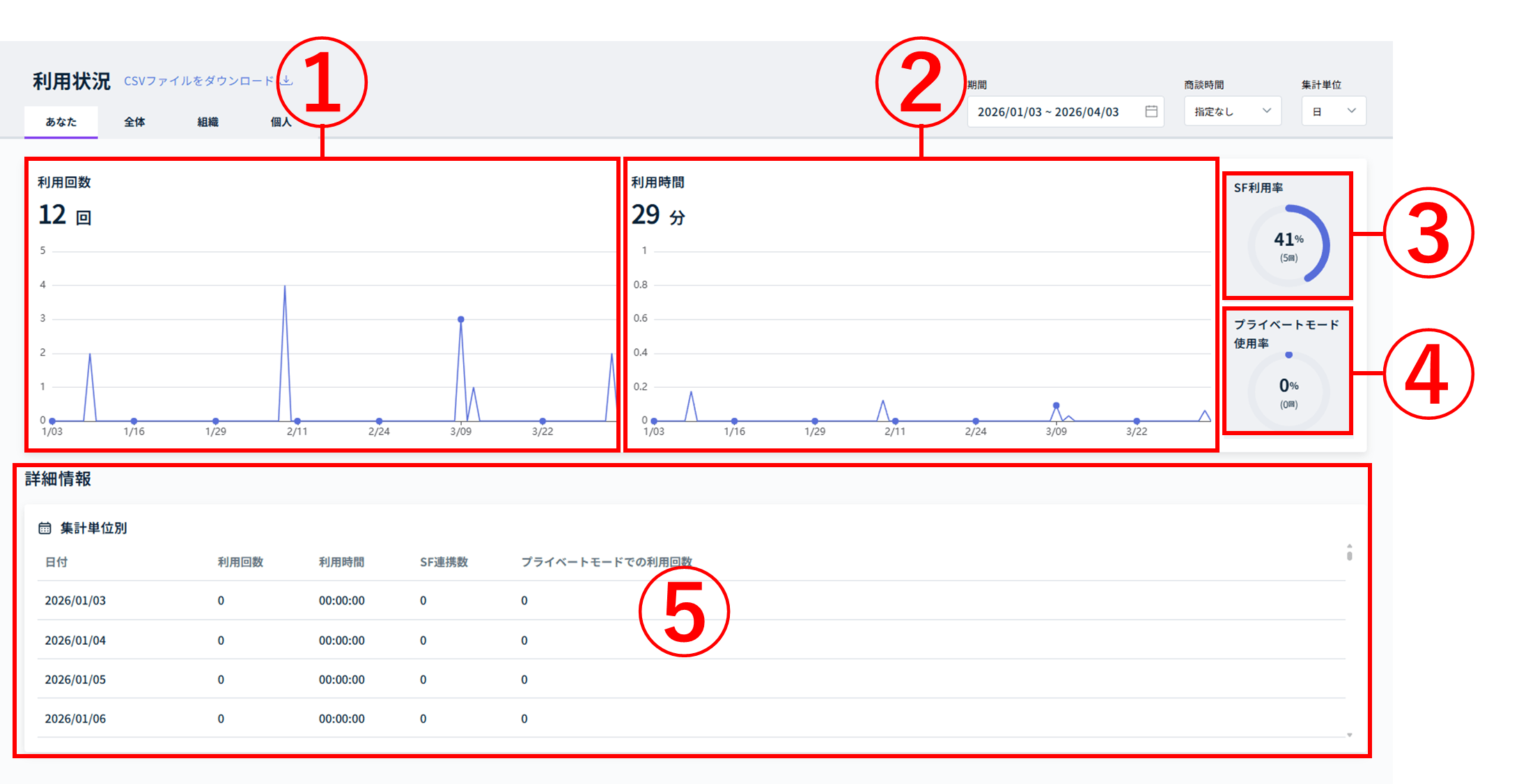 - 左上部には指定した期間内の合計利用回数が表示されます。
