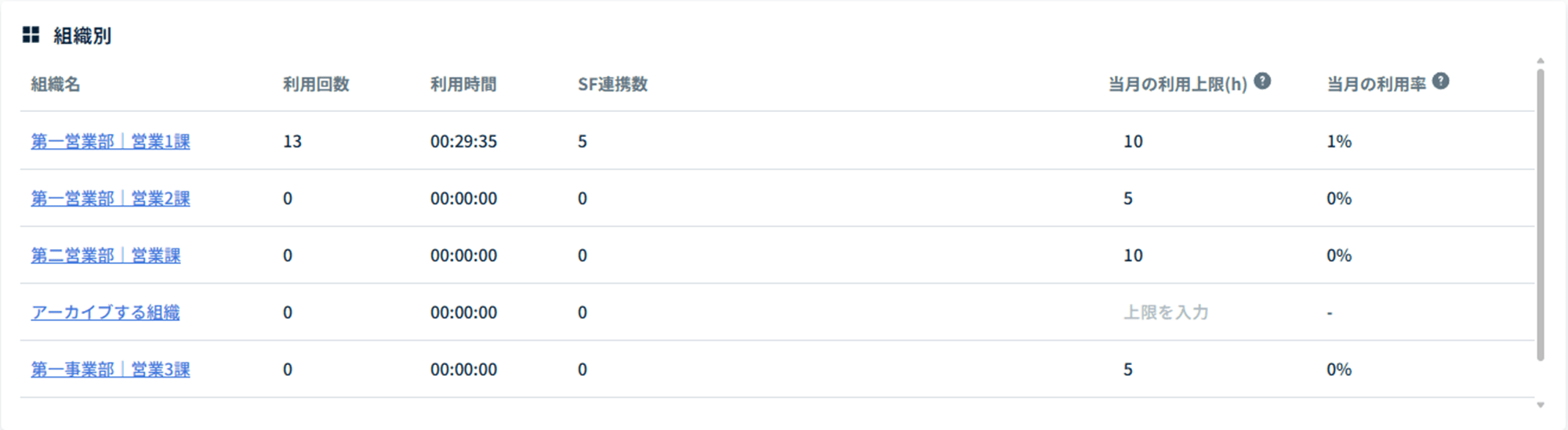 組織別の利用状況が表示されます。
