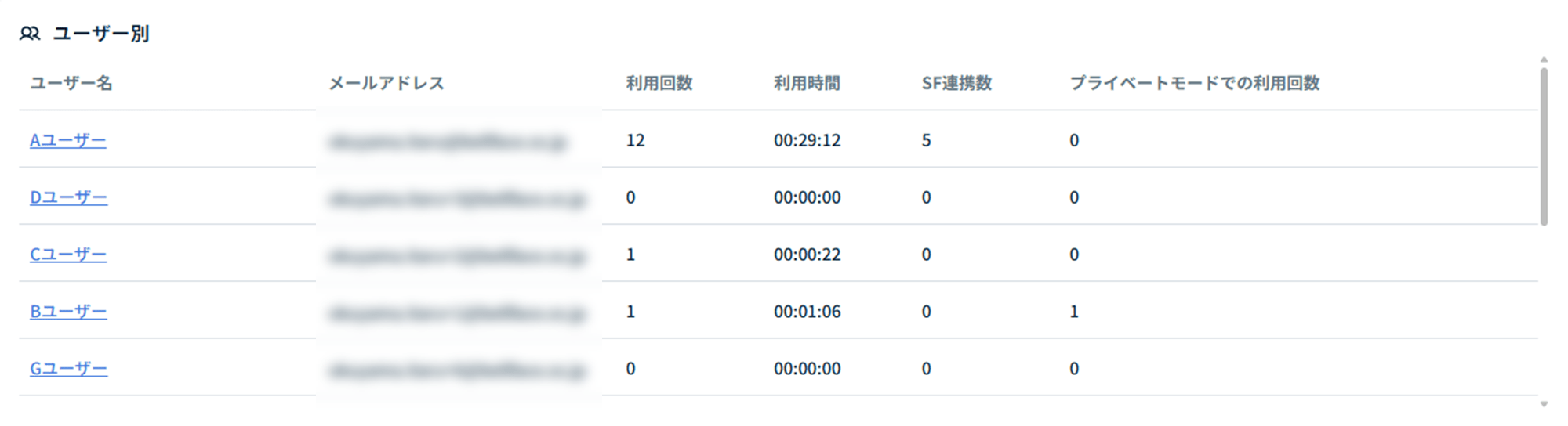 - 各ユーザーのプライベートモード利用回数が表示されます。