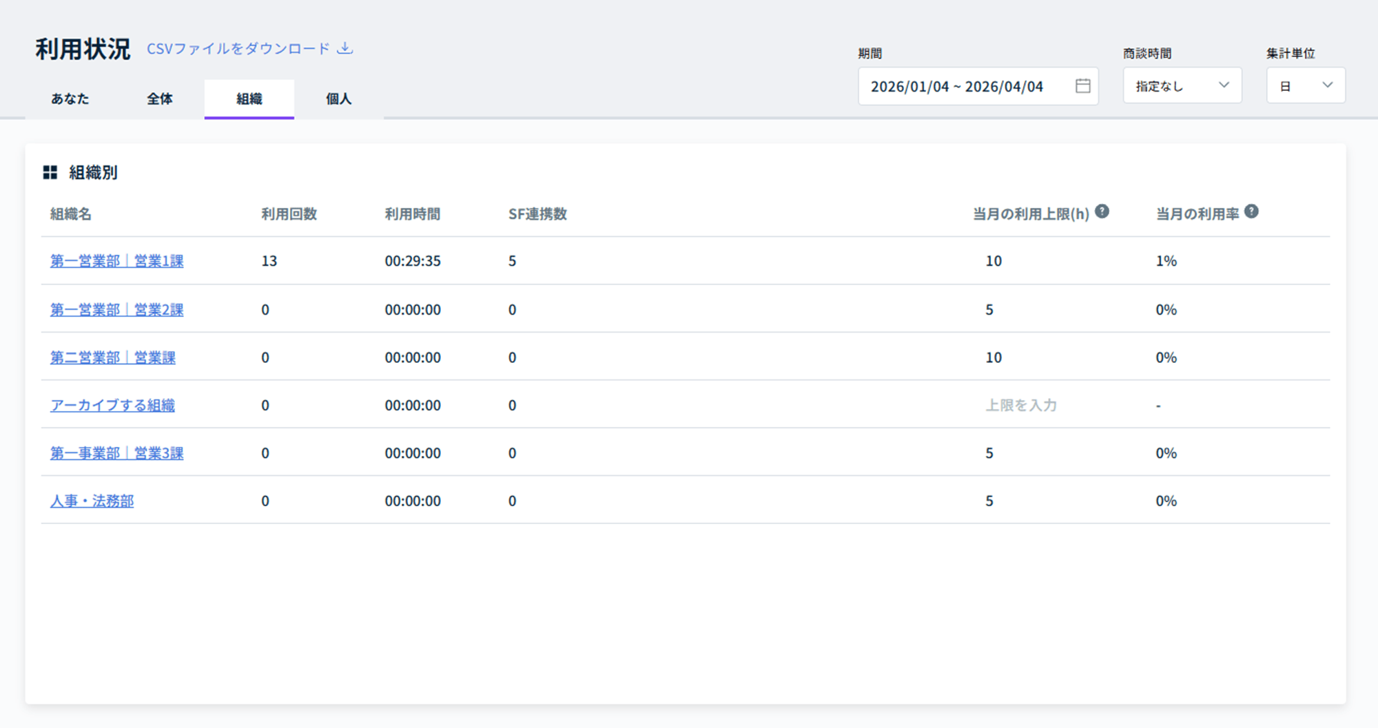 利用状況の[組織]タブでは、ご利用環境の組織ごとにbellSalesAI利用状況を確認することができます。