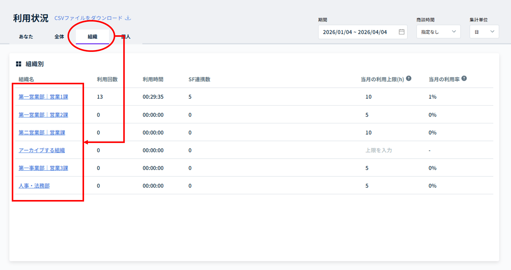 ここでは、組織単位の利用状況を確認する手順を解説します。