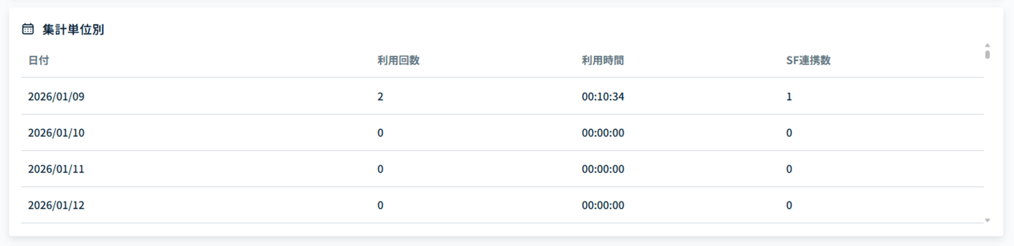 画面右上の「集計単位」で選択した日次・週次・月次ごとにデータが表示されます。