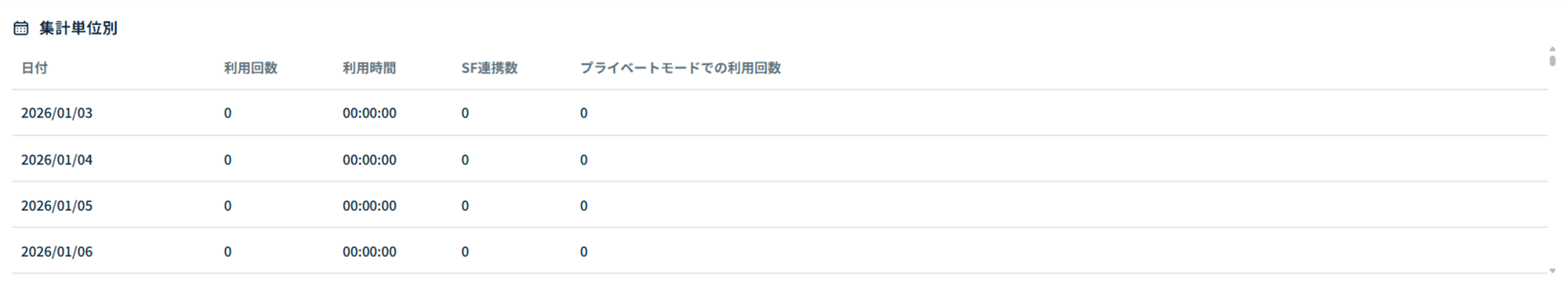 画面右上の「集計単位」で選択した日次・週次・月次ごとにデータが表示されます。