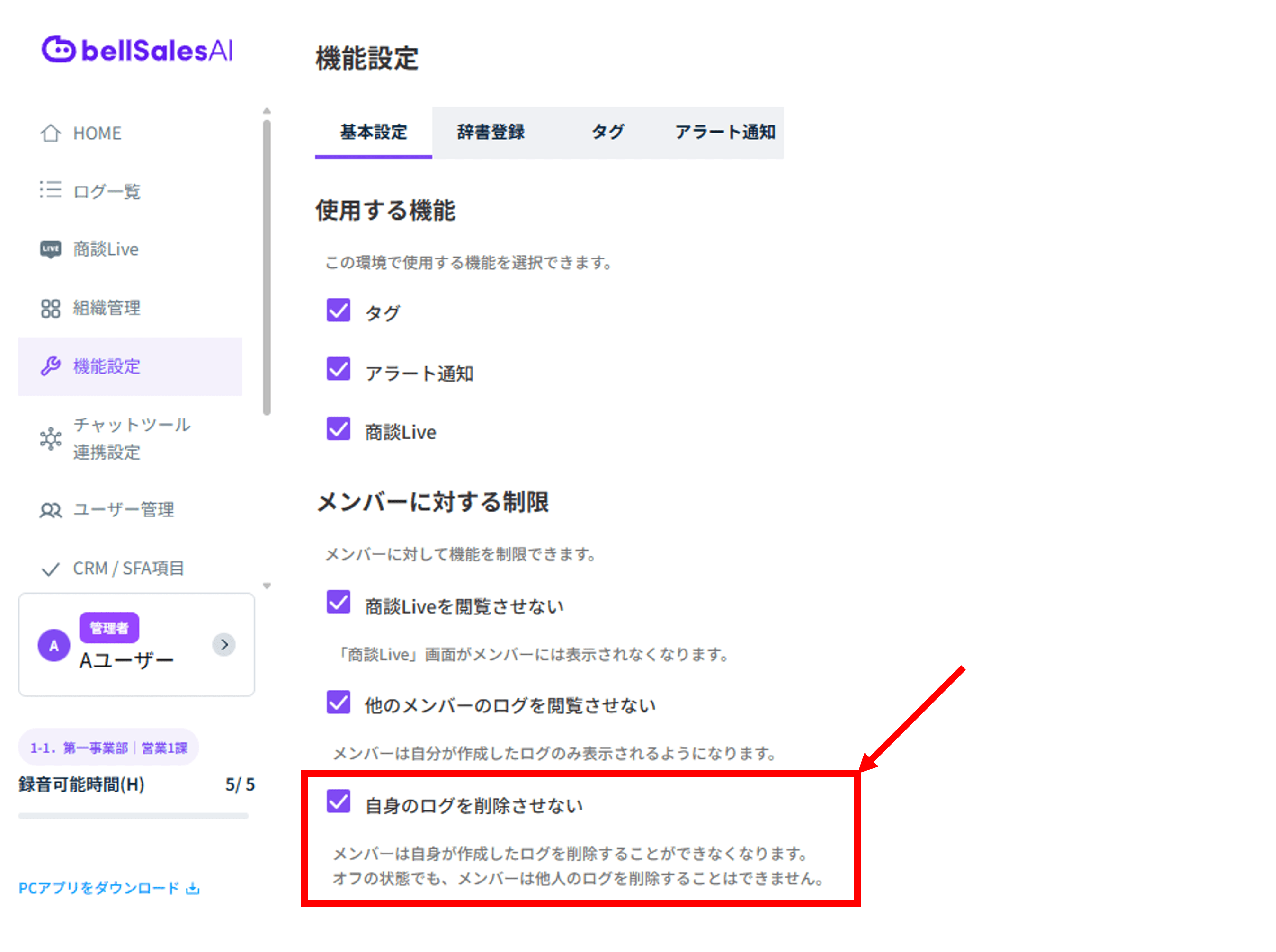 サイドメニュー > [機能設定] > 「基本設定」 > 「メンバーに対する制限」 > 「自身のログを削除させない」の設定による動作が以下に変更となります。